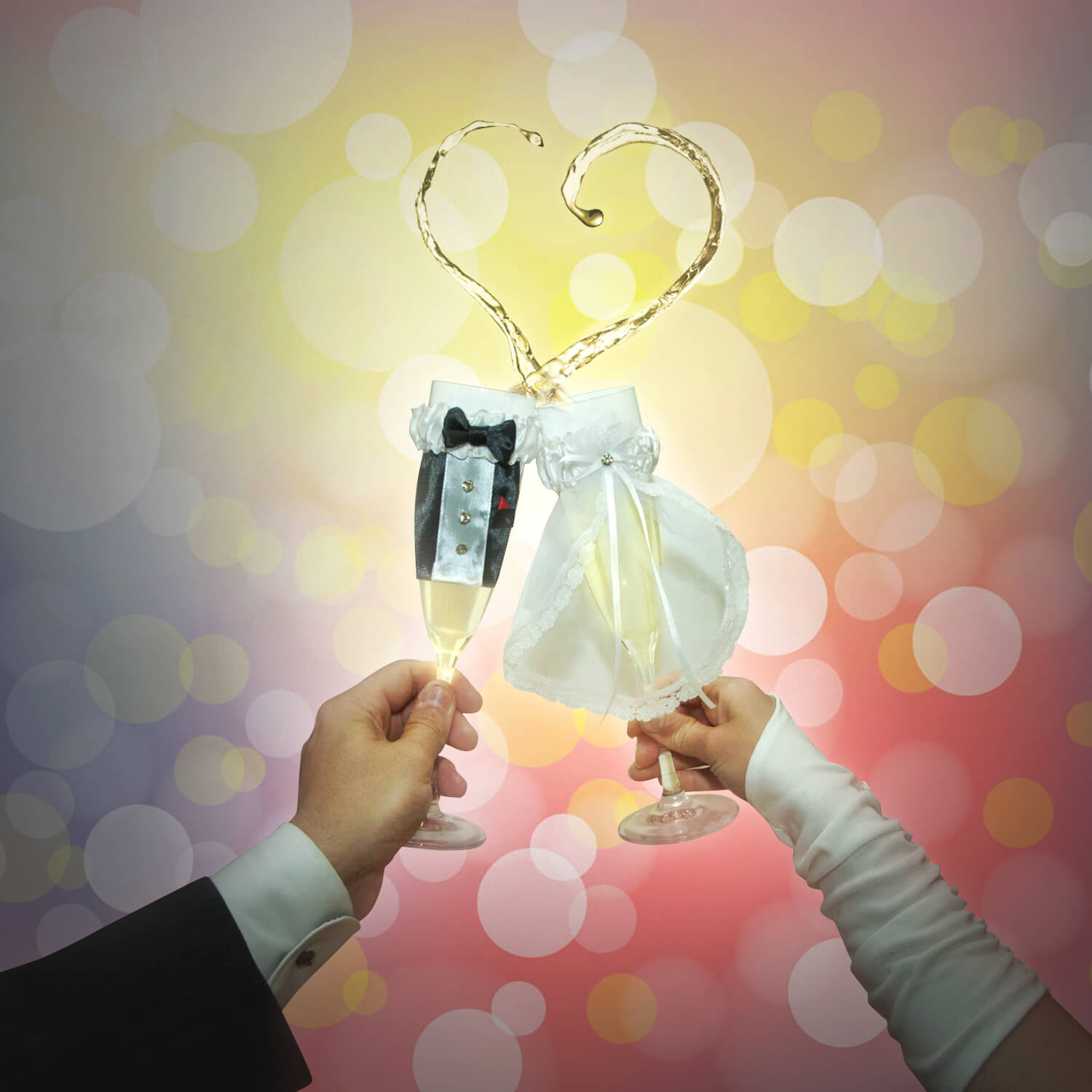 Erfreue das Brautpaar mit einem Highlight: Hochzeitsüberraschung, Hochzeitsspiel und Hochzeitsdeko, inklusiv die Sektglas-Dekoration als ein Hingucker und ein besonderes Anstoßen auf das Brautpaar.